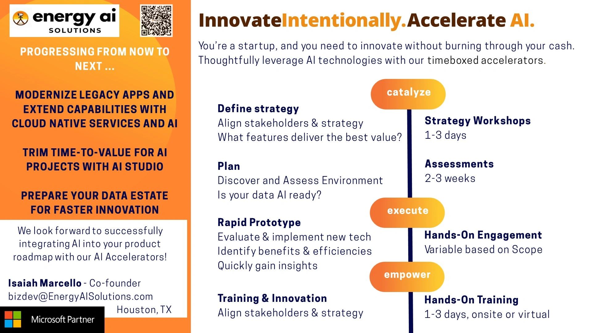 As a Microsoft Partner, the Energy AI Solutions team is adept at leveraging Microsoft tools and programs to help you get started quickly on Azure.